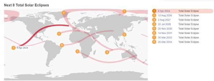 The event on April 8th 2024, however, is a little different. The 184-km wide path of totality will extend across 15 US states, whilst its ground track across North America will include Sinaloa, Durango and Coahuila in Mexico and Ontario, Quebec (where it will brush both Toronto and Montreal respectively), New Brunswick and sweep over the Labrador coast of Newfoundland close to St. Johns. This means it will be potentially visible (weather permitting) to around 32 million people in the US alone. What’s more, and in a rarity for total eclipses, it comes just seven years after the last total eclipse was visible from the continental United States (prior to that, the previous one to occur over the contiguous US was in 1979, and the next will not be until 2044).