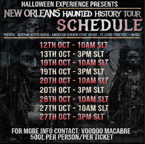The performances I referred to above feature Theatre 6 in The Witches of New Orleans, with shows at 12:00 noon SLT on Sunday, October 13th, 2024 and 13:00 SLT on Saturday, October 26th, 2024. Dates and times of tours, meanwhile, are per the poster, above right.