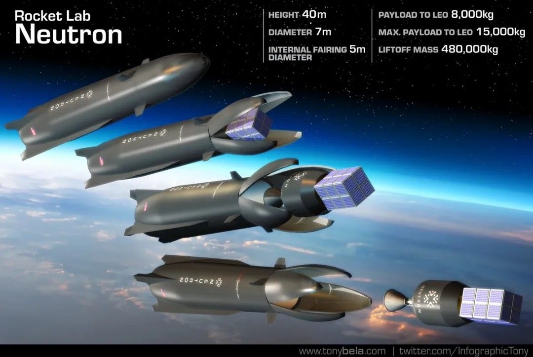 Neutron is intended to be a 2-stage, partially-reusable medium lift launch vehicle (MLLV) in roughly the same class as ULA’s Vulcan-Centaur and SpaceX’s Falcon 9. However, it is of a highly innovative design, the second stage of the vehicle and its payload being carried aloft inside the first stage, within a set of clamshell payload fairings the company calls the “hungry hippo”. These open once the rocket has cleared the Earth’s denser atmosphere so the payload and its motor stage can be released, the core stage then returning to land on a floating platform.