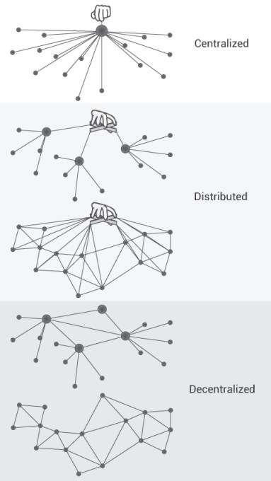 Centralised, distributed and de-centralised networks – blockchains utilised decentralised networks