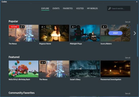 May and June have seen a couple of platform updates – release notes here and here. Both offer continuing support for events, with the most recent also featuring a revamped Nexus and updates to the user on-boarding process. Other updates among the recent pair of of releases include new events-oriented templates creators can use for their own events, ability for world owners to mute all voice users in their environments, additional shaders and bug fixes, but I’ll be focusing here on the Nexus and on-boarding.