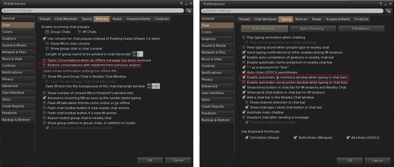 Functionality to save and restore open resident-to-resident IMs from the previous session (Group chat sessions are not always ready in time during start-up, making their restoration unreliable): Preferences → Chat → Notices → Restore conversations with residents from previous session.