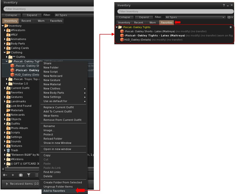 - Supports the addition of individual items or folders in Inventory to the Favourites tab in the floater.
