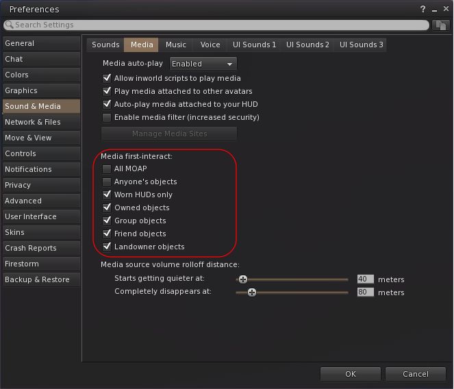 - Media on a prim (MOAP) interaction option can now be set individually (when set, does not require a first click to focus before interaction can begin): Preferences → Sound & Media → Media → Media first-interact.