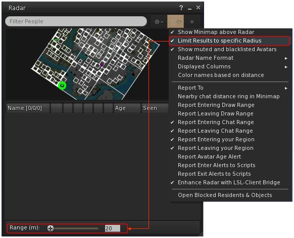 - World Menu → Radar (or Radar Toolbar button)→ Radar Options drop-down → Limit Results to specific Radius → open range panel at the foot of the floater.