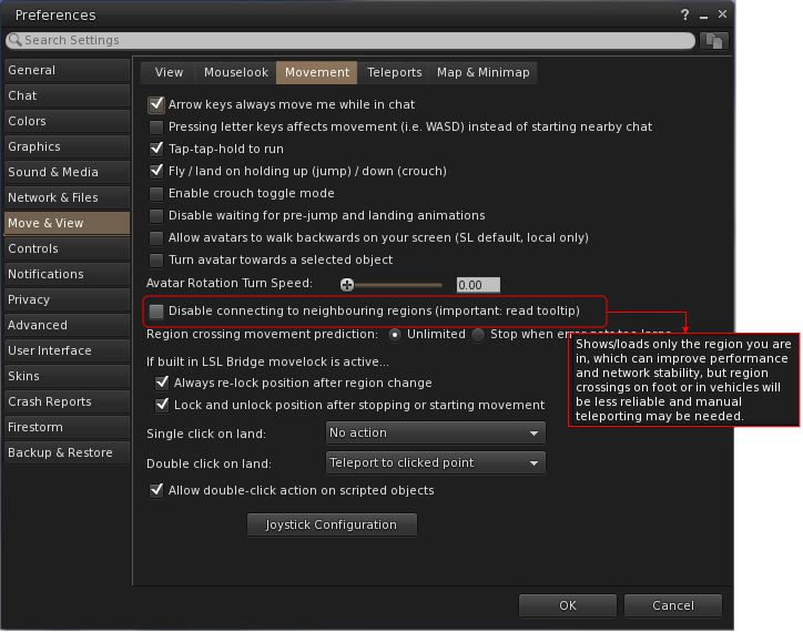 - Prevents the viewer from connecting to neighbouring regions (which are ignored by the viewer), and only the current region (login/teleport destination) is connected, effectively isolating it.