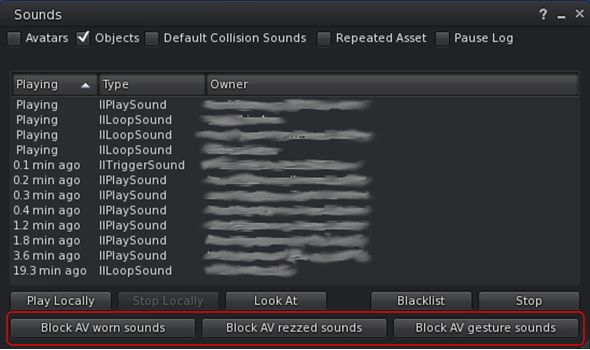 - Asset Blacklist: new Flags column to the Asset Blacklist to denote if the muted sound is one of Avatar Worn Object Sounds, Avatar Rezzed Objects Sounds or Avatar Gesture Sounds.