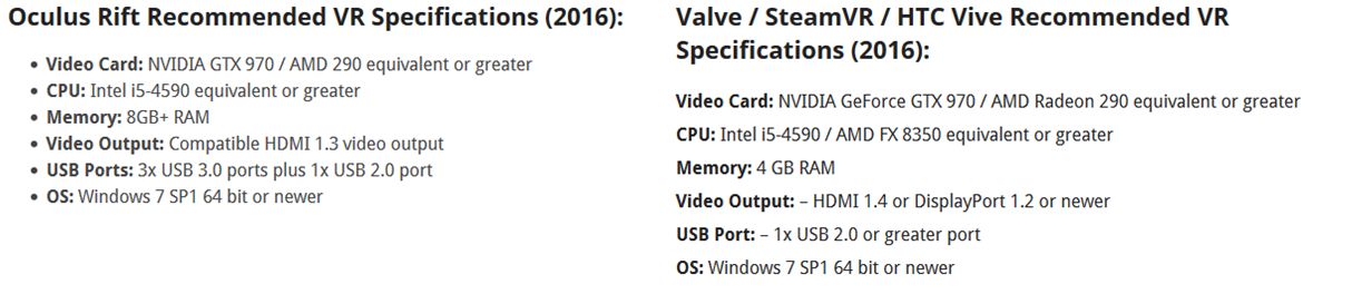 If you’re going to VR, then Oculus and HTC have already set a min spec for what computer you need. There are already tools on Oculus‘ and HTC’s site you can run on your computer to tell you whether you computer’s ready for that hardware. So that’s something we don’t have any say in, they’ve already said that that’s the min spec for VR, done.