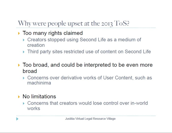 01:46: People were upset because the Terms of Service was too broad and that it could be interpreted to be even more broad. I don’t interpret it this way, but the concern was that it could be even more broad. and there were concerns over derivative works of user content, such as machinima, that if you made a video of your own stuff on Second Life, that Linden Lab could have some claim to it, and that there were no limitations. That because the Terms of Service was written the way it was, and had no limits to it, that creators would lose control over the things they created in-world or uploaded to the world.