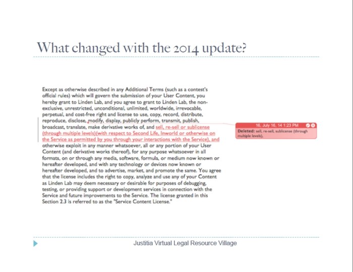 03:04: This is what they changed, right here. So really, what changed? The words on the list of the rights that you grant Linden Lab changed order. That’s really the most important thing that changed. And also a parenthetical limitation was added.