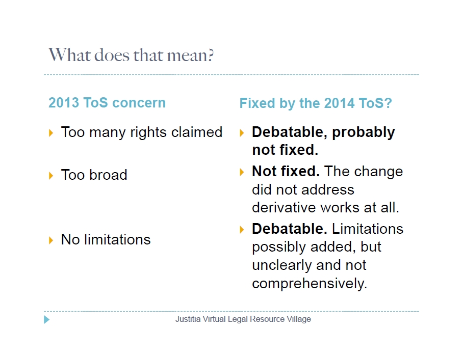 07:29: So that’s kind-of where we stand right now. as far as the concerns that people have had, the Terms of Service still claims too many rights; it may or may not be fixed. It’s still too broad because the concern that people had about derivative works is not addressed at all. that section of the Terms of Service comes after this change, and is not affected by it; and the no limitations concern … I don’t know. It might be fixed; it might not be fixed. It really depends on what that limitation applies to. and unfortunately, what we have is that the only way we have to decide whether or not this poorly written parenthetical applies to the whole list or to part of the list is to argue it in court; and that’s expensive. Nobody wants to be that test case.