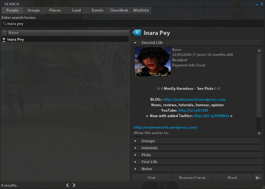 Alchemy now has full legacy search support, which includes the ability to display all the information on a selected item (such as my profile, as seen above) on the right side of the search floater panel
