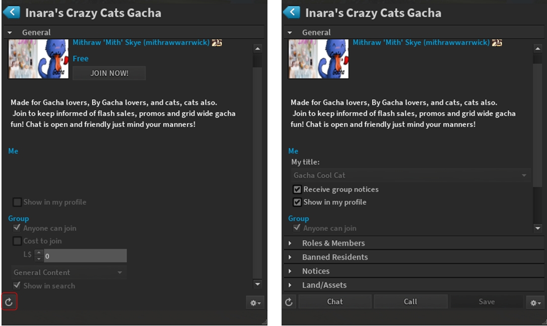 When using the Search option to locate a group you have not joined, the results pane will only display the essential information on the group (l). However, should you then join the group, clicking on the reload button (highlighted on the left image) and the group information will update to a full display