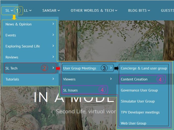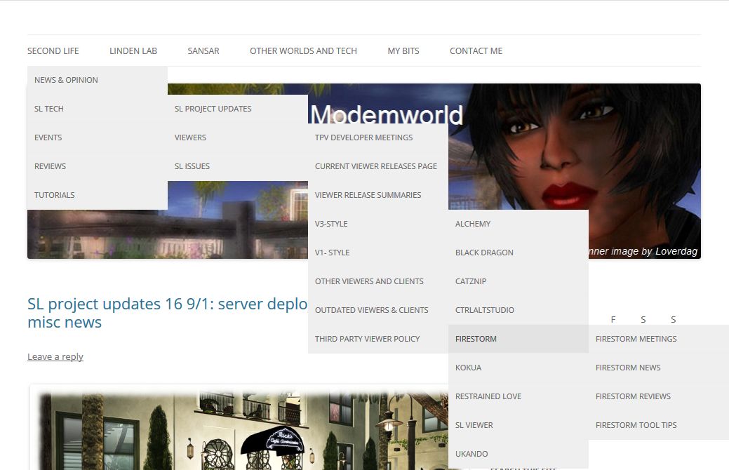 SL (unchanged): provides access to all Second Life posts and pages, divided into the following sub-menus / categories, including news items, opinion pieces, my Exploring Second Life travelogues, all of my SL user group meeting summaries, art reviews, all viewer reviews, etc.