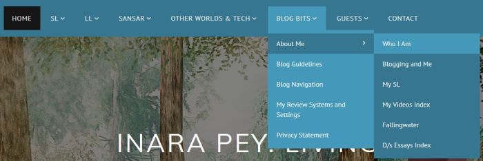 Blog Bits (new): this now combines general information on this blog (blog guidelines, blog navigation, privacy statement and my review systems specifications), my “personal” items (biography, SL home life, my blogging journey, my SL videos, etc.), as shown in the image above.