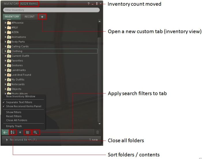 - A SHOW RECEIVED ITEMS option has been added to the gear icon button. When checked, the Received Items panel will be displayed in the Inventory floater; when unchecked, Received Items appears as a folder within the Inventory floater.