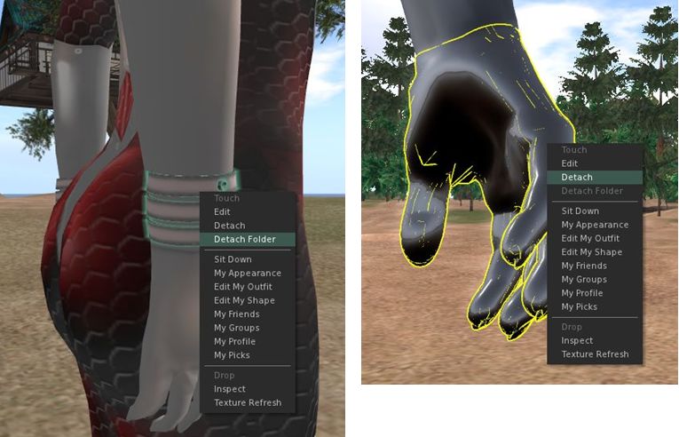Catznip introduces two useful features – Detach Folder and the ability to right-click on worn rigged mesh items.