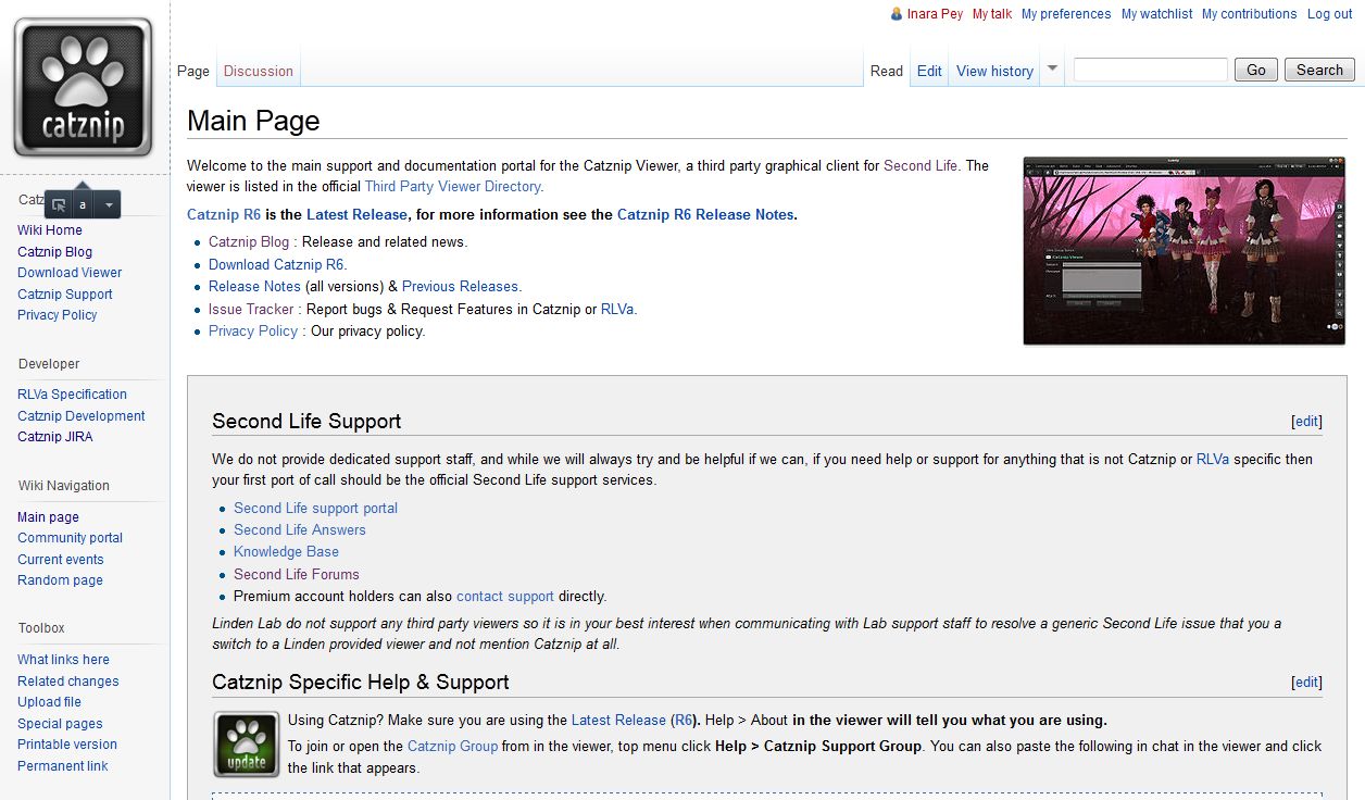 The Catznip wiki, together with the Catznip blog can be accessed from within the R7 release, via the HELP menu. Similarly, HELP->REPORT BUG will open the Catznip JIRA in your web browser (or the built-in browser, depending on your preferences setting), rather than attempting to open the default LL Bug Tracker.