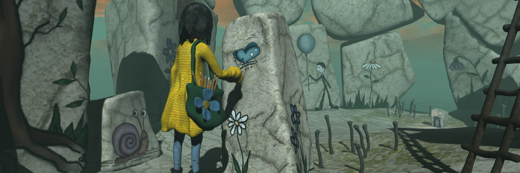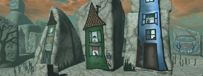 Burlap is a marvellous setting where just about everything is fashioned from that fabric (also known as hessian in some parts of the world). The ground is a stitched-together pattern of plain and coloured burlap swatches, the houses, vases, pots and boxes that lay scattered across it similarly so, while a ribbons the fabric forms a road that winds around and over the land. Even the posts and fences are made from the stuff, as are the flowers that sprout from vase and pot.