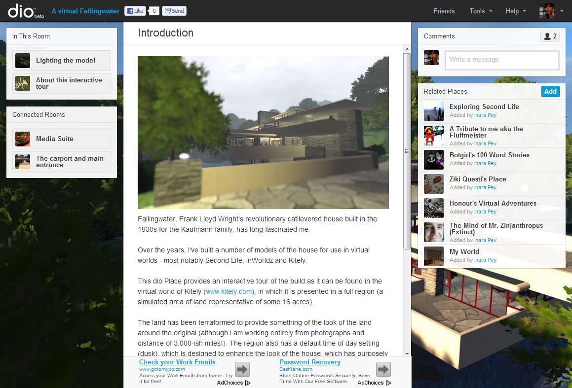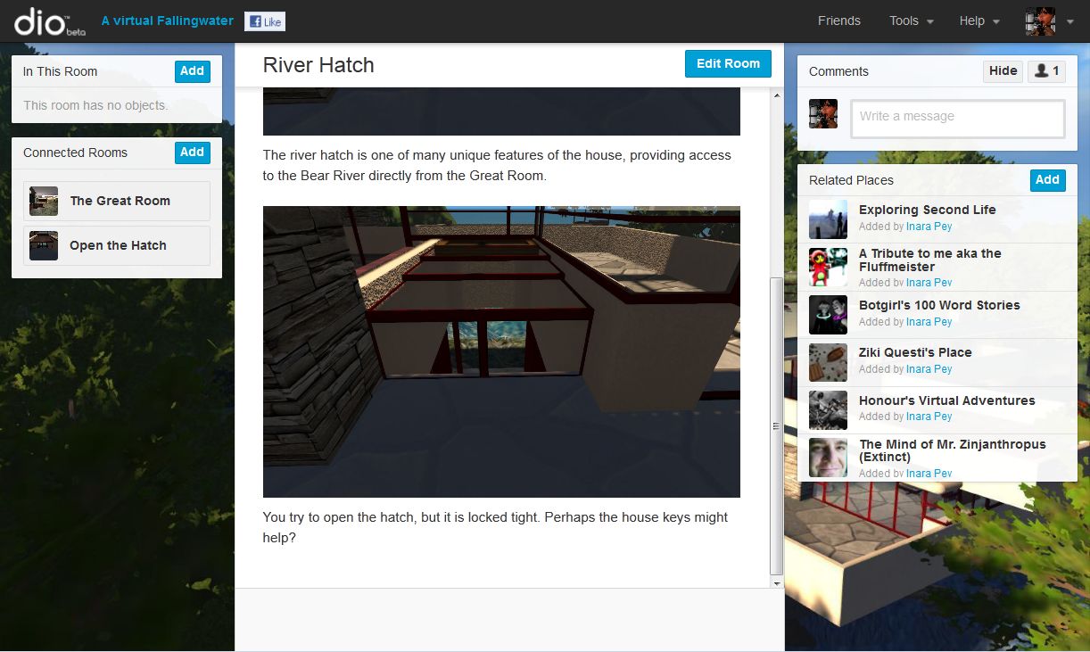 The tour is intended to let people understand something of the build – what it is, where it resides, etc., before allowing them to set off to explore it on their own, moving through the various dio “rooms” (which I’ve roughly aligned to rooms and parts of the Fallingwater build) where they can see images and find out more about both the real and virtual Fallingwater as interpreted by myself.