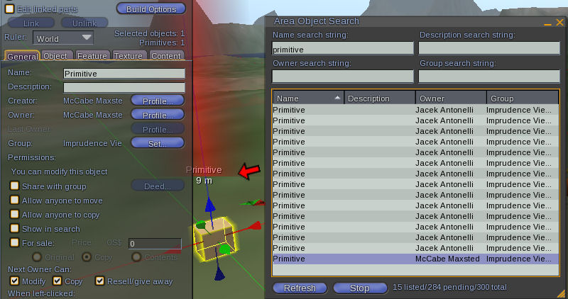The Imprudence team have been very wise in including the Area Object Search. As builders and Estate Managers who have used it will testify, this is a real boon when a prim / object zooms off to heaven knows where due to a careless co-ordinate input.