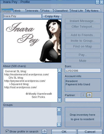 Overall, the new Avatar tab layout is very logical and helps the information it presents “flow” more easily from screen to eye to brain. Even so, it risks getting some criticism in that many put time and effort into laying-out their About windows (as I have to a small degree) – and the reduced width of the window means this careful formatting is lost when a Profile is viewed in Imprudence, and any Profile formatted to the Imprudence About window will look odd in other 1.23.5 Viewers. However, this really is a minor niggle: people face the same problems when viewing / creating Viewer 2.x Profiles.
