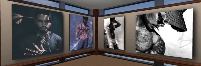 For 2021, the gallery is displaying the talents of four invited 2D artists – Ethan Lane, Looker Lumet, OSO (akash25g Resident), and Akim Alonzo, whose images are displayed together with works by members of the Men in Motion Dance Troupe and 3D sculptures and pieces by Mistero Hifeng, Silas Merlin, Harry Cover (Impossibleisnotfrench) and Jⓞhan Lionheart (AndreJohan).