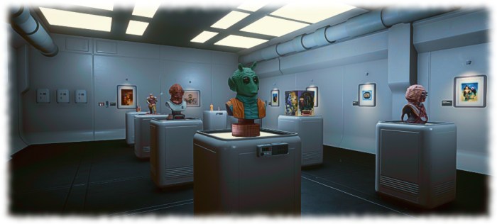 Fortunately, each time the experience spins-down when no-one is using it, things get replaced on the next spin-up (the reset buttons on the various stands do not appear to work). Note, as well, that the Exit door to one side of the last exhibition space will drop you back into the Star Wars spawn point, on the sound stage.