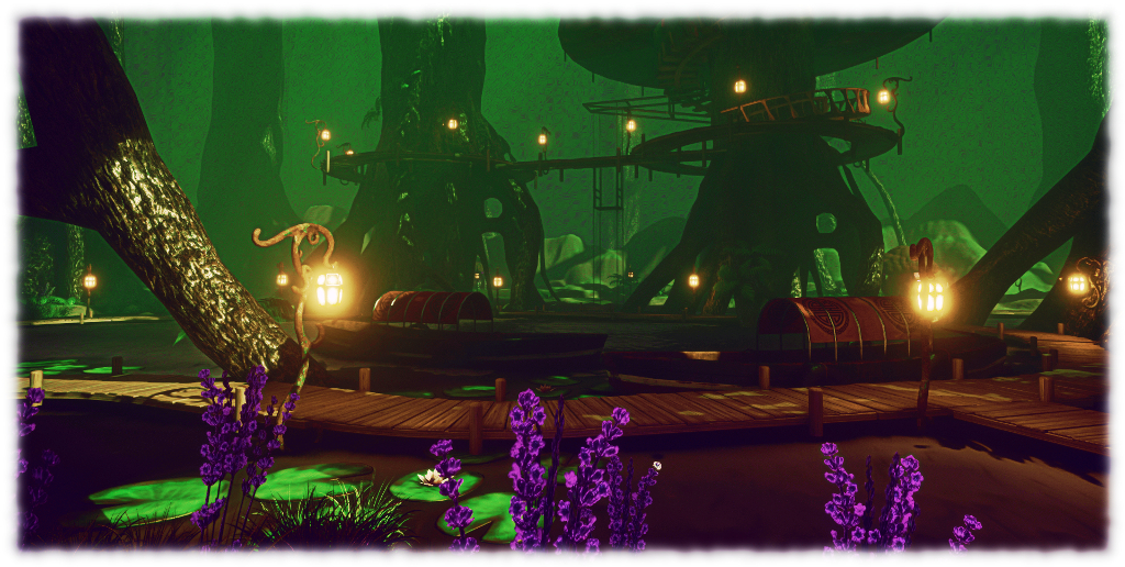 A wooden board walk runs around the water, winding under the roots of the trees and along the shoreline. Ornate lanterns illuminate this path, with giant mushrooms, the undersides of their cups glowing softly, adding a little more colour to the scene. The lanterns tend to put one in mind of elven lamps, although the boats – one of which gently tracks its way in a never-ending loop around the water – are perhaps more sampan in style and have tyres as fenders, again revealing this is not necessarily a purely fantasy realm.