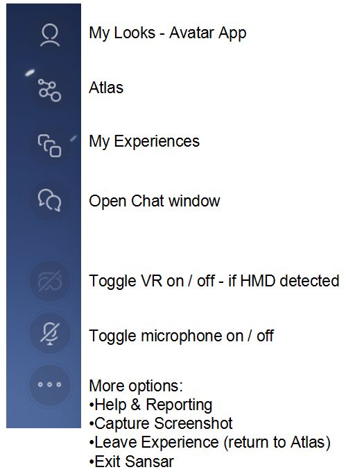 The UI icons in Sansar’s run-time mode are relatively self-explanatory. Hovering the mouse over any of them will display additional hover text.