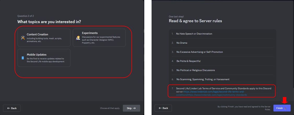 - Agree to the server rules – follow the links to the Second Life Terms of Service and the Community Standards (both of which applying to the Second Life Discord Server).