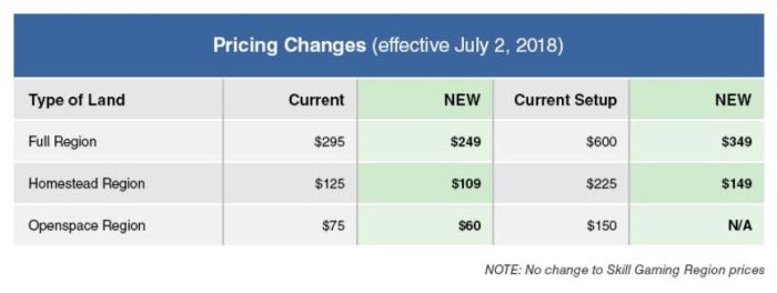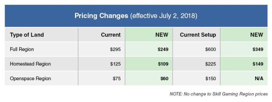 On July 2nd, 2018, the most ambitious change to private region pricing in Second Life came into effect: a reduction of 15% in private region maintenance fees (tier) for all current region types and reductions in the set-up fees for Full and Homestead regions (new OpenSpace (“water”) regions no longer being offered as a product from July 2nd, 2018).