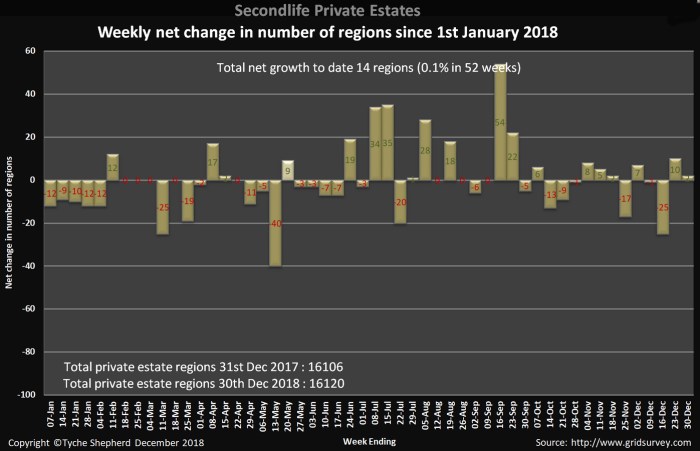 The surface level reading in the summary is good: overall, the grid increased in size by 2.1% – the first such increase since 2011, leaving the grid at a total of 23,811 regions at the end of December 2018, compared to 23,337 at the end of 2017. However, where private regions are concerned – still the major revenue earner for the Lab – things were far more modest: just 14 regions up on the year, from 16,106 to 16,120 – a 0.1% growth. The rest came from Mainland, up 460 regions to 7691, thanks largely to the arrival of the SSP continent.