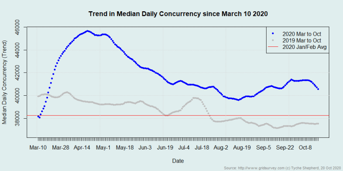 Following-on from Tweets in June -, Tyche confirmed that overall, median concurrency on the platform saw clear growth in March through mid-May (when the first ’bout of lockdowns hit a fair portion of the world due to the pandemic, before gradually falling through until mid-August, when a further “bump” occurred that lasted through until October (when Tyche made her Tweet). She also showed that overall, median concurrency remained well above that seen in 2019.