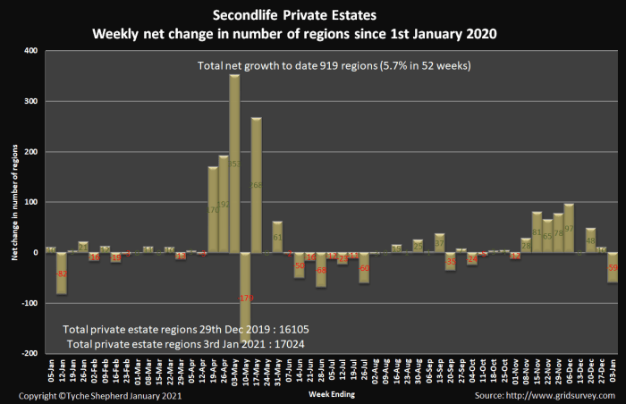 On January 3rd, 2021, Tyche tweeted her year-end analysis on private region numbers, revealing that 2020 saw an overall net growth of some 919 private regions (Full and Homestead) through the year, representing a 5.7% increase.