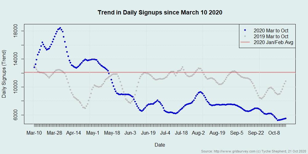 However, on the other, the graphic reveals a niggling concern: whilst sign-up have remained relatively stable for a number of years, with occasional peaks and crevasses, 2020 saw a distinct decline in sign-ups from the end of March through until early October, despite an initial spike in sign-ups in the March-April period, again potentially fuelled by the pandemic. In particular, the drop-off not only saw sign-ups fall below the average set in the first two months of 2020, but also fall and remain below average sign-ups seen throughout 2019.
