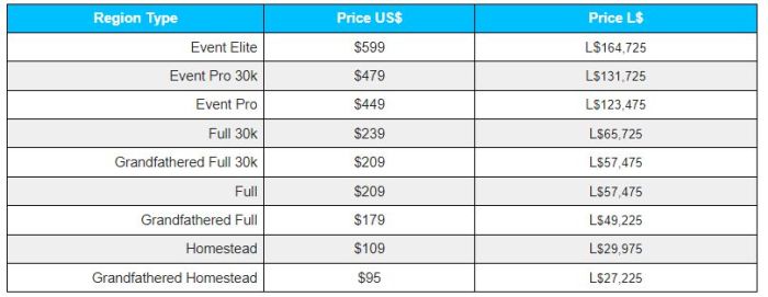 Note that the monthly Homestead tier and the US $30 / month for the Full Private region land capacity bonus remain unchanged.