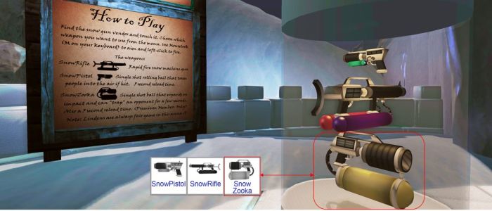 Collect your weapons at the vendors in the Snowball Arena. If you are Premium, you can use your Premium Member’s Token or HUD to claim the Premium-only Snow Zooka weapon (outlines in red on the HUD and in the vendor, above)