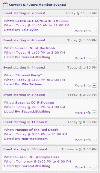 Events are counted down in terms of the number of hours before they commence, while clicking on the + button can open-up an additional pane of information on the events (what is is, who is participating, for example) as well as displaying any SURL / URL that was included in the original event notice. I personally find it more appealing than the SL “dashboard” web page Events list.