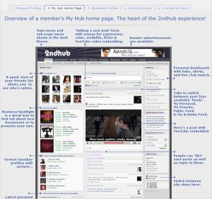 MY HUB is effectively your 2ndHub home page. From her you can access your message options, view your dashboard (both also available from your Profile), and which features live “feeds” on forthcoming events, new users signing-up to 2ndHub, the most recent messages published to the Public Feed, and a very useful rotating selection of business profiles created on 2ndLife – click on any of the featured businesses to go to the page for the business and find out more information, or hover over the + sign for an insert with expanded information.