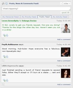 The “What’s Happening” text box allows you to send out messages on any subject you like – how you’re feeling, general greetings, observations, etc., – a-la Twitter and Plurk. Messages can be targeted to go to all 2ndHub users, or just to your Friends, or even just to yourself. You can also set-up who can comment in reply.