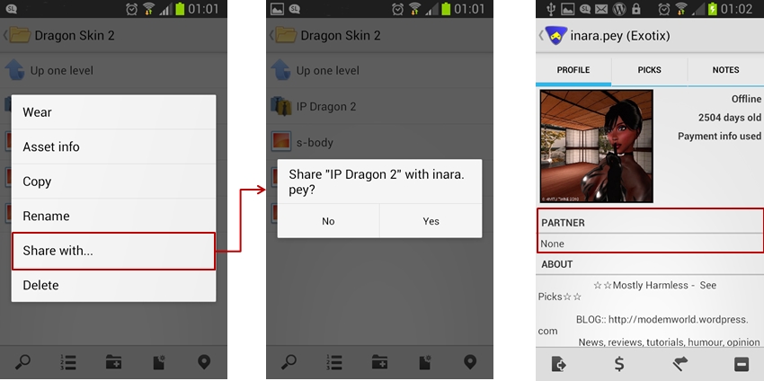 Lumiya 2.5.5 allows you to share / give inventory items with / to others (left and centre) and also display partner information in the Profile display (right)