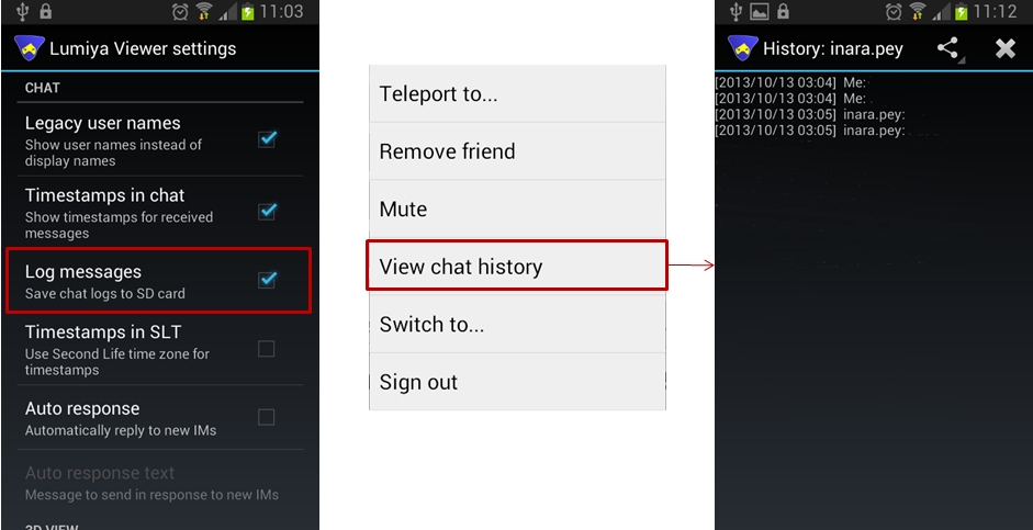 View chat history: make sure the Log messages option is checked (l); from the chat / IM screen, tap the Menu button on your device and select the View Chat History option (c) to open the history, if available (r). Note that if the option is not displayed, there is no history file to view