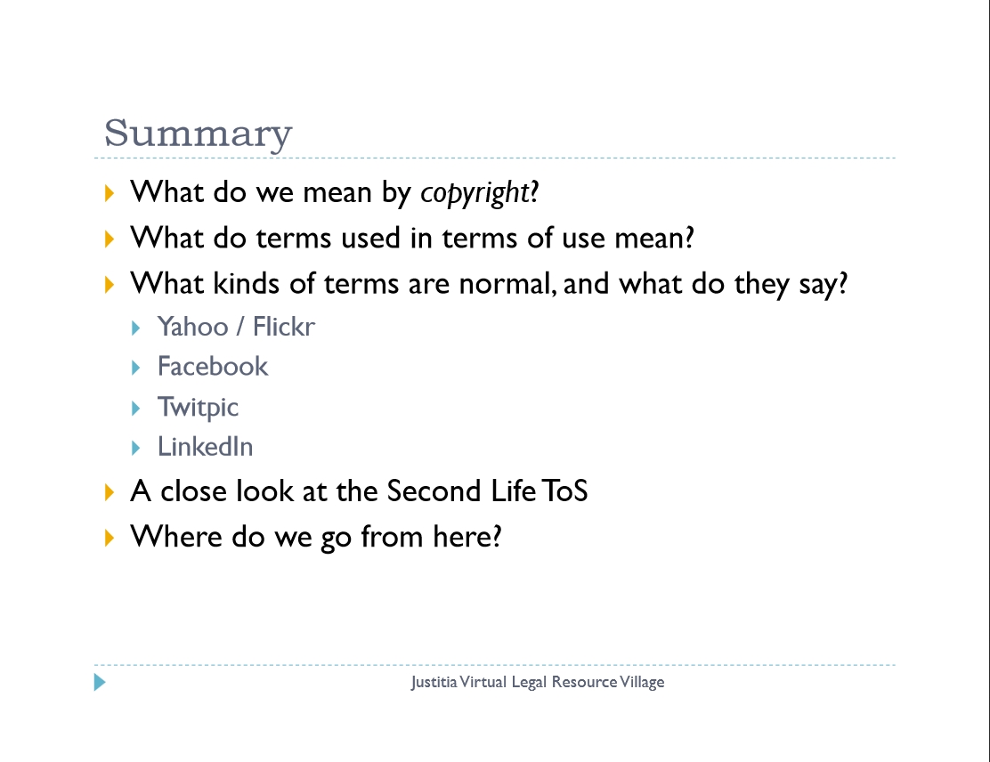 00:44: First, we’re going to talk about, a lot of the rights we’re talking about here are copyright rights. So we’re going to talk about what exactly we mean by copyright, and then we’re going to talk about the terms that show-up in the terms of use and what exactly they’re claiming in the terms of use. Then we’re going to look at what terms are normal in a terms of use, and I know that a lot of people have posted some other terms of use, maybe from OpenSim or whatever, but we’re going to look at some of the other terms of use that we see a lot in social media. Then we’re going to take a close look at the Second Life terms of use, once we have a grounding; and then we’re going to look at where we go from here, and then Tim and I are going to start talking about where we go from here once we know what the playing field looks like.