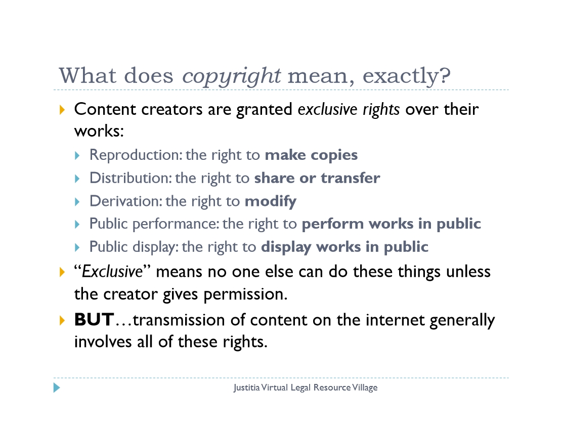 And “exclusive” means that nobody gets to do any of those things unless you give them permission. But, when we look at the Internet, the Internet generally involves all of those rights. In order to transfer something across the Internet you’ve got to make a copy of it, you’ve got to transfer it across the Internet, you’ve got to be able to modify it; in Google you see thumbnails, those are actual modifications of the work. You’ve got to be able to publicly perform something in YouTube, you’ve got to be able to display works in an browser or what have or – or a viewer.