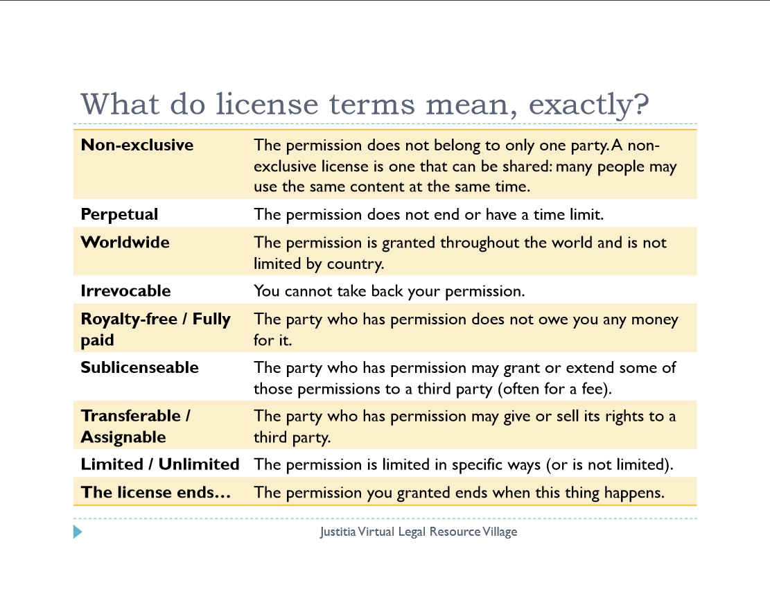 - Sub-licensable – when you give somebody permission to do a whole bunch of things, that person can then turn around to someone else and say, “OK, you get to do X, Y, and Z to this content”, even without the permission of the creator