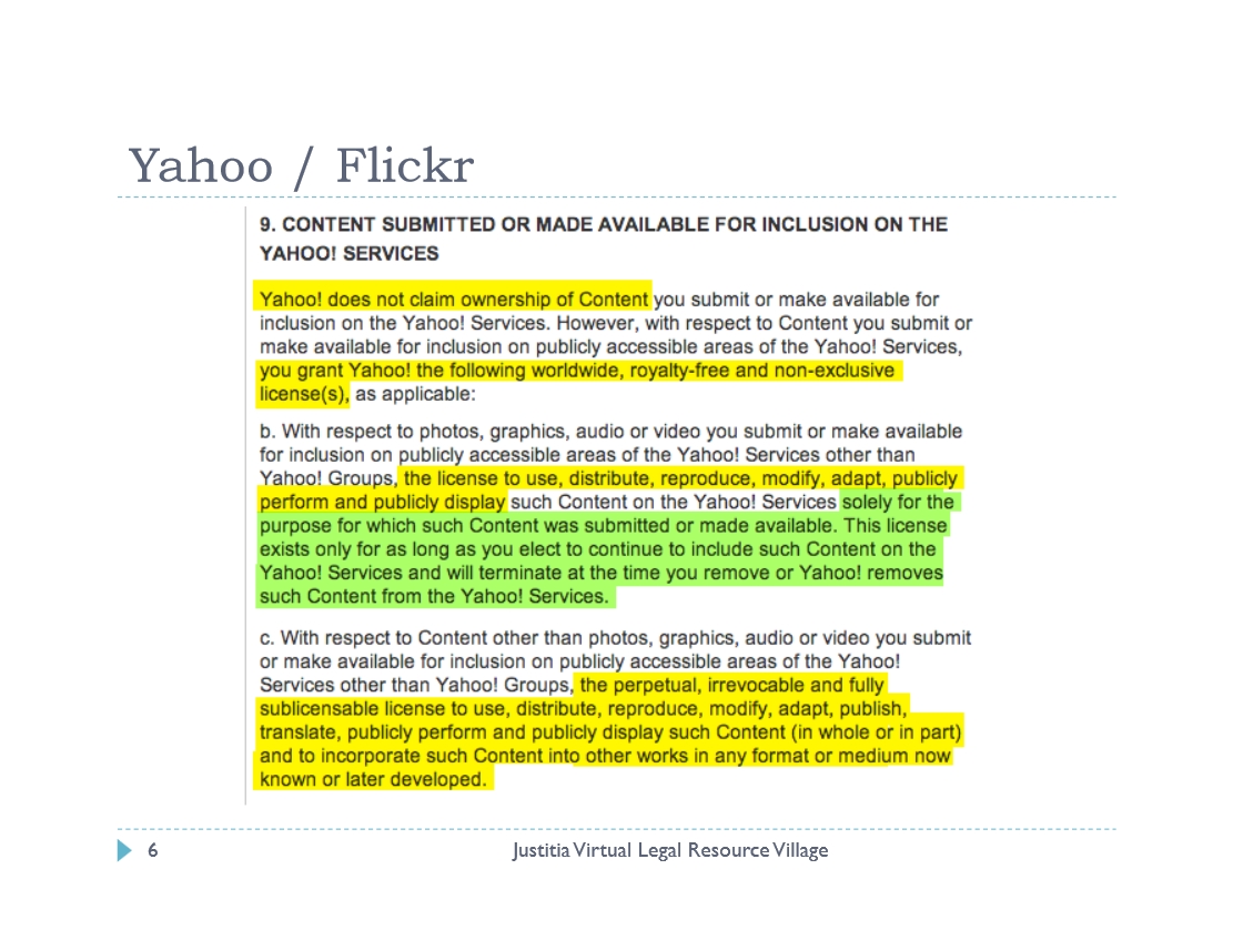 06:07: Most of us are familiar with Flickr. So [with] Flickr, you’ll see that Yahoo does not claim ownership of content, so your content is your own, and you grant Yahoo a worldwide, royalty-free and non-exclusive licence – and that’s common. It needs to be worldwide licence because Yahoo is visible worldwide. They need royalty-free because Yahoo doesn’t want to pay you every time you put something up on Flickr, and they need non-exclusive, because Yahoo doesn’t want exclusive licence over your content. If Yahoo had exclusive licence over your content, then Yahoo would be the only person that ever got to use your content, including you. So non-exclusive is a good thing.