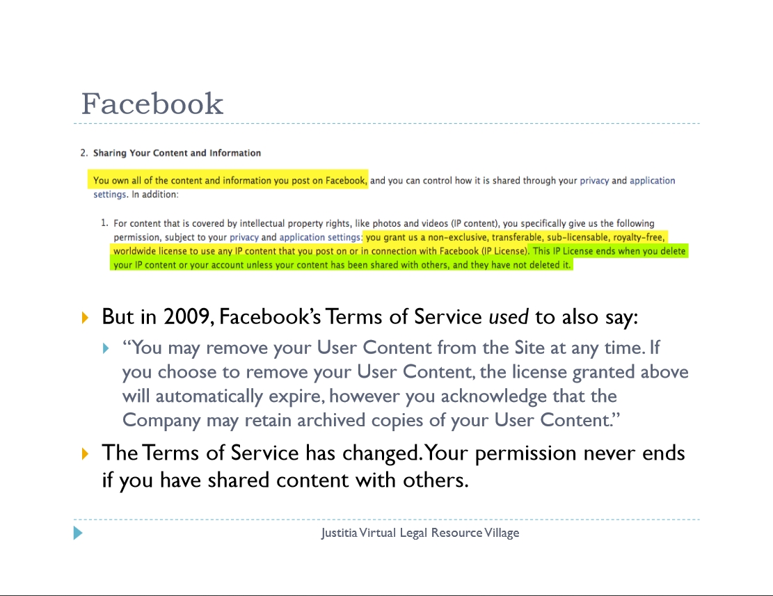 - First: you retain intellectual property rights that you already hold. If you already have the rights to your content, you own your content. That doesn’t necessarily mean that you can stop anybody from doing anything with it if you’re giving away all the permissions. So let’s keep going