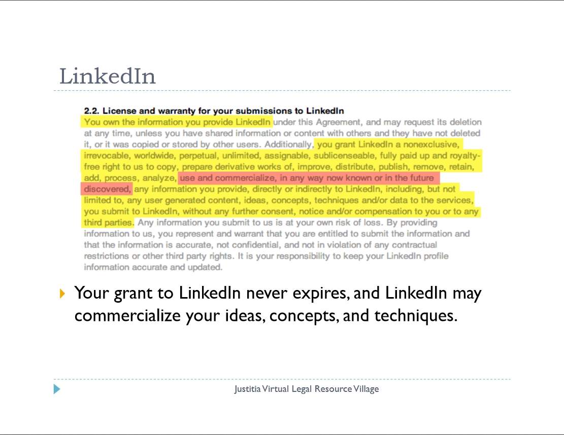 08:59: And LinkedIn is also fairly evil. LinkedIn requires not only the ability to use and commercialise in any way known or in the future discovered, they want to use and commercialise not just your content, but your ideas, concepts, techniques or data. So if you have a business idea that you post to LinkedIn, LinkedIn can take it, use it and commercialise it.